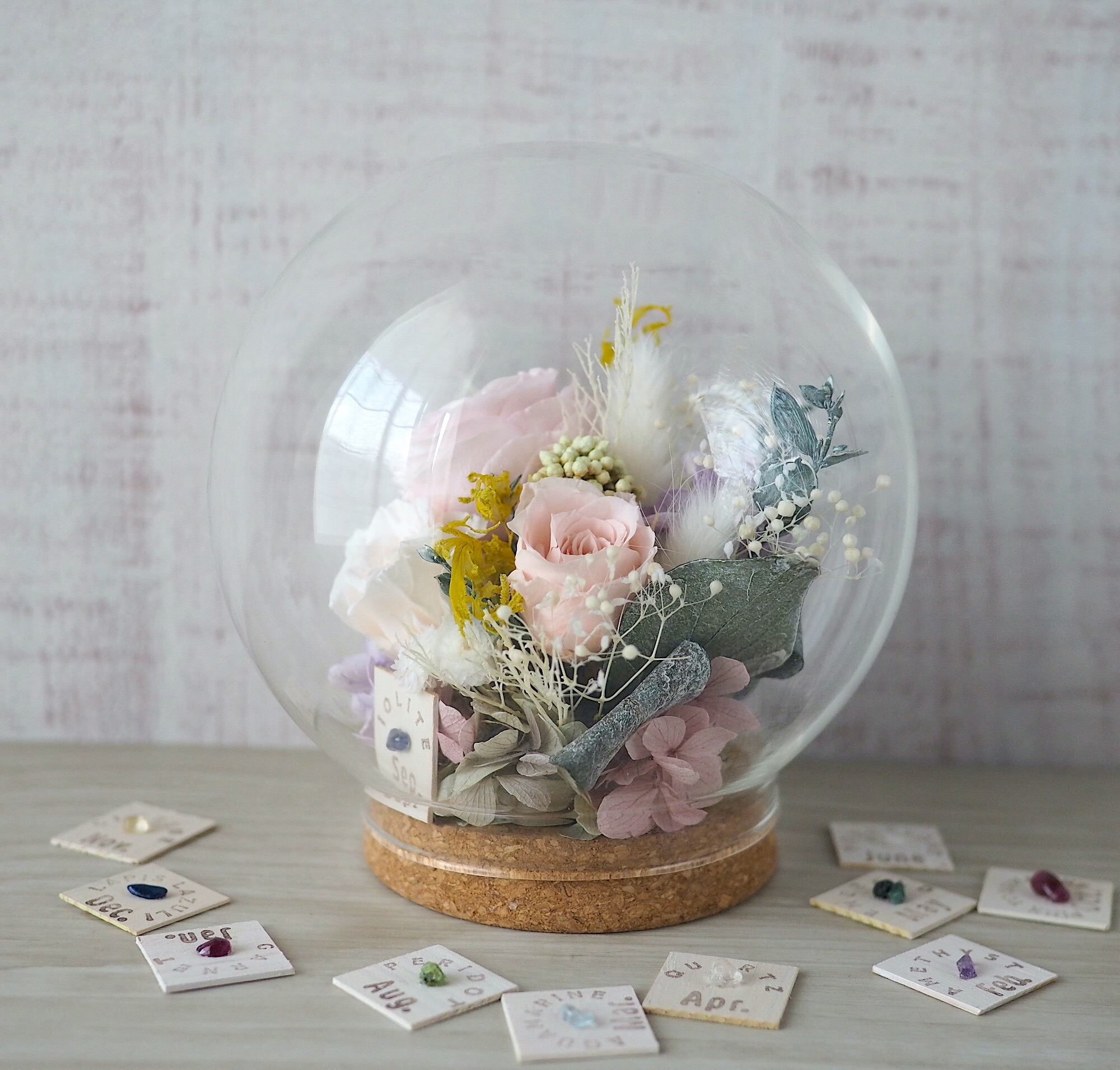 コロンと丸くて可愛いガラスボトルの中にプリザーブドフラワーのローズをメインにアレンジした誕生石のフラワードーム。