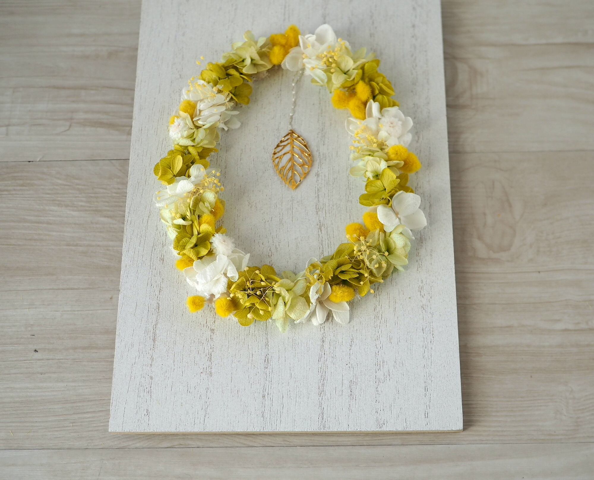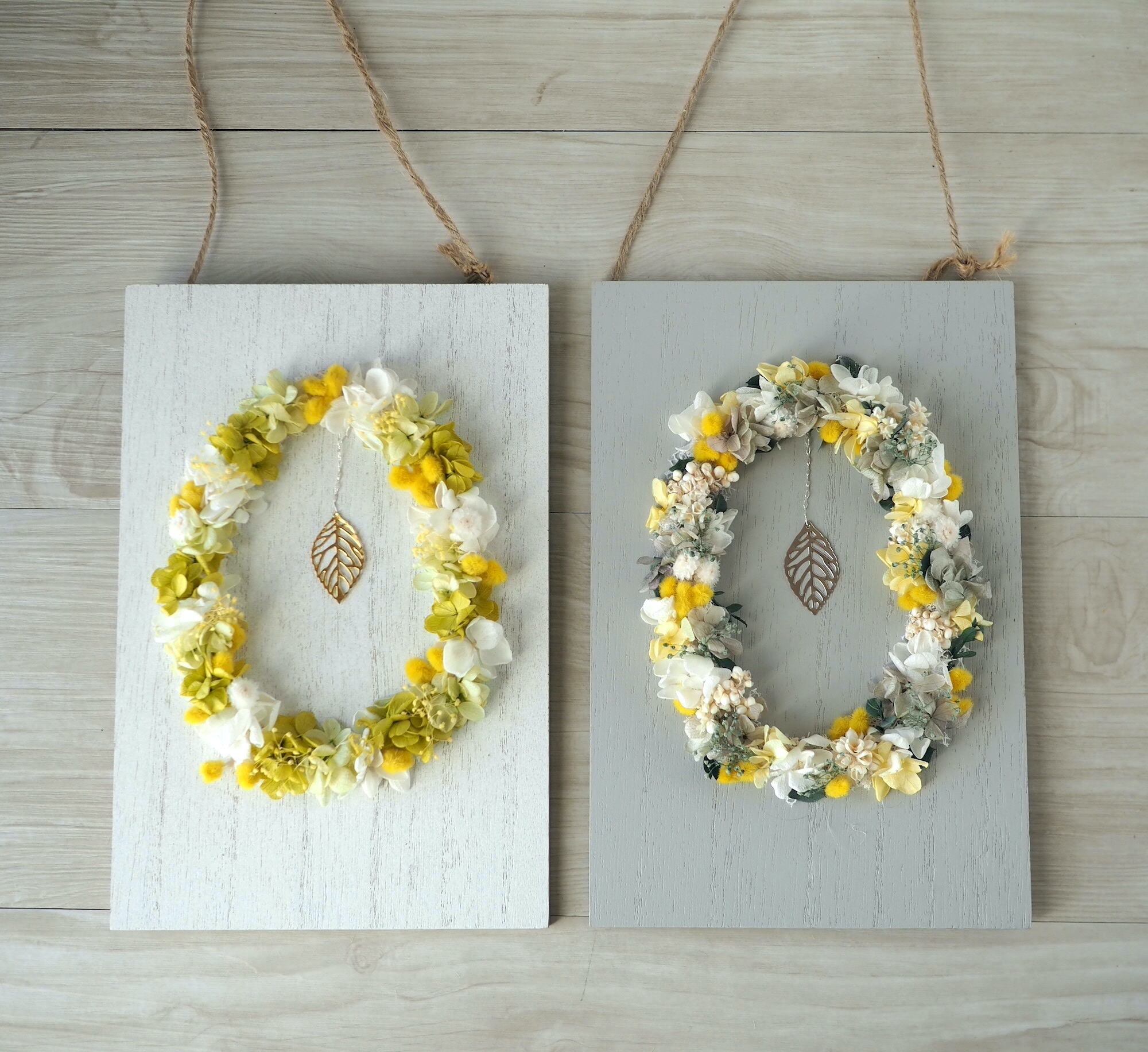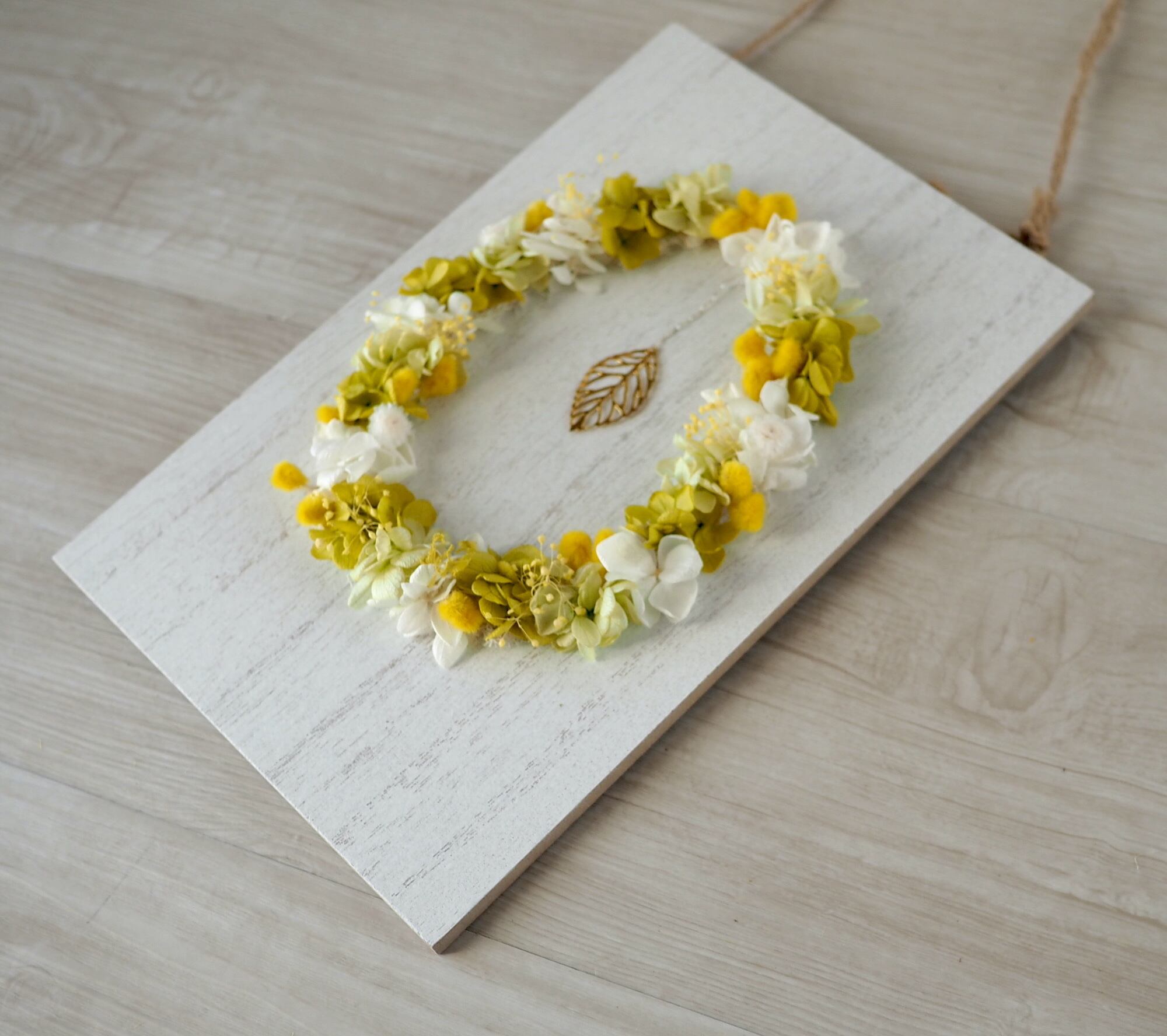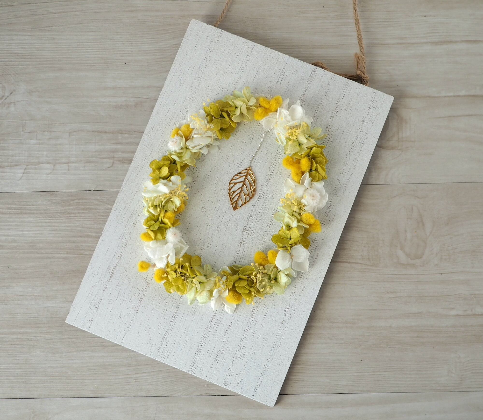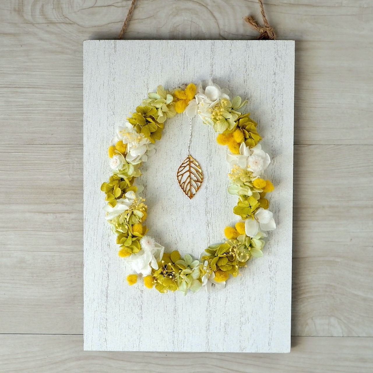フレーム付きの壁に掛けて飾れるミモザのフラワーリース。
