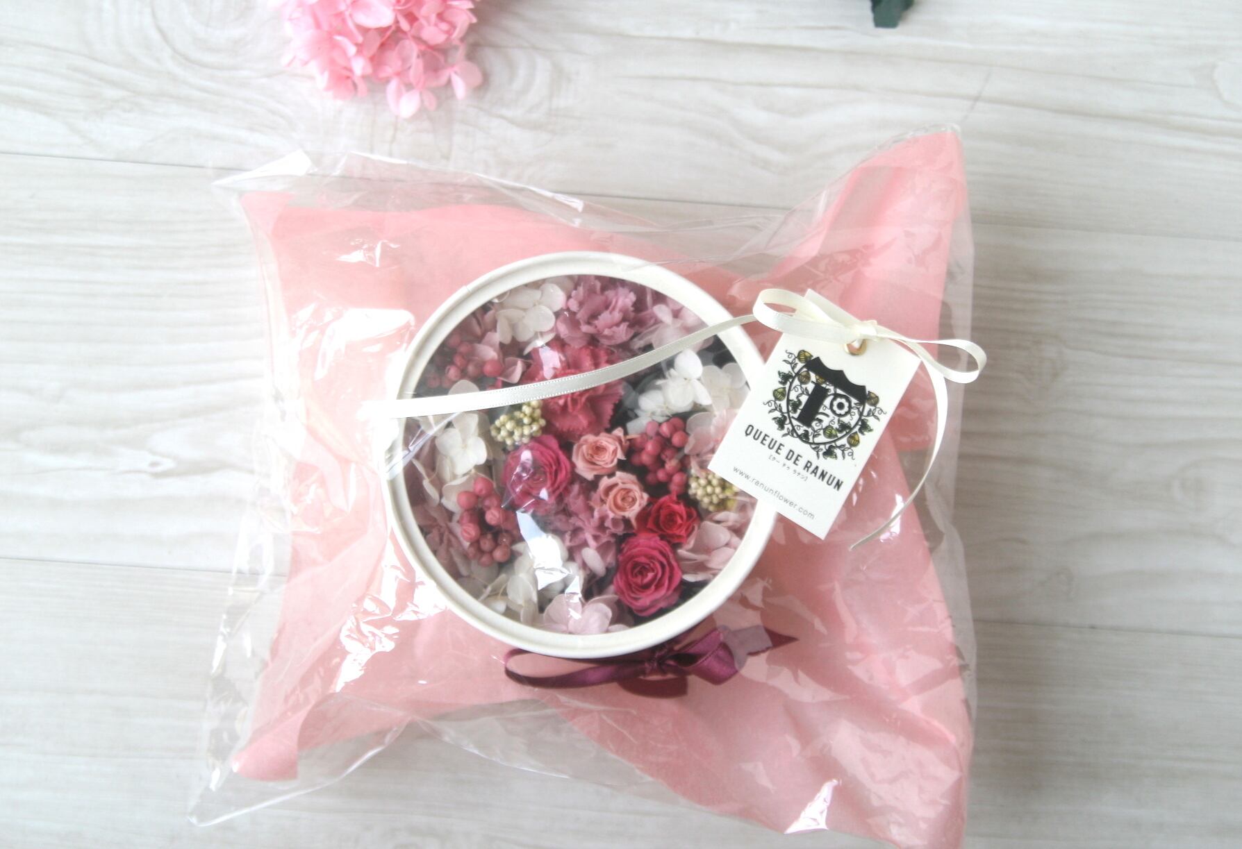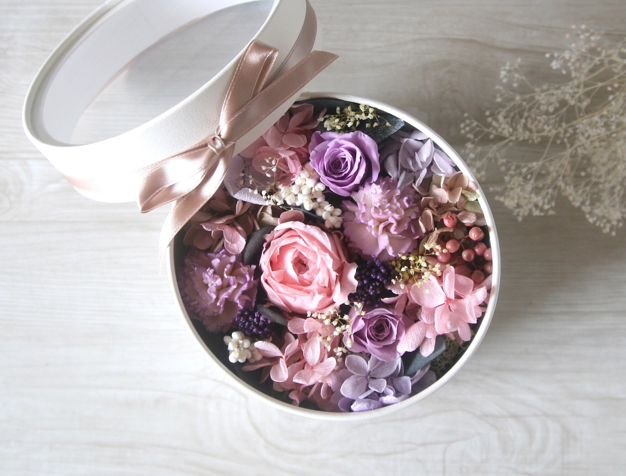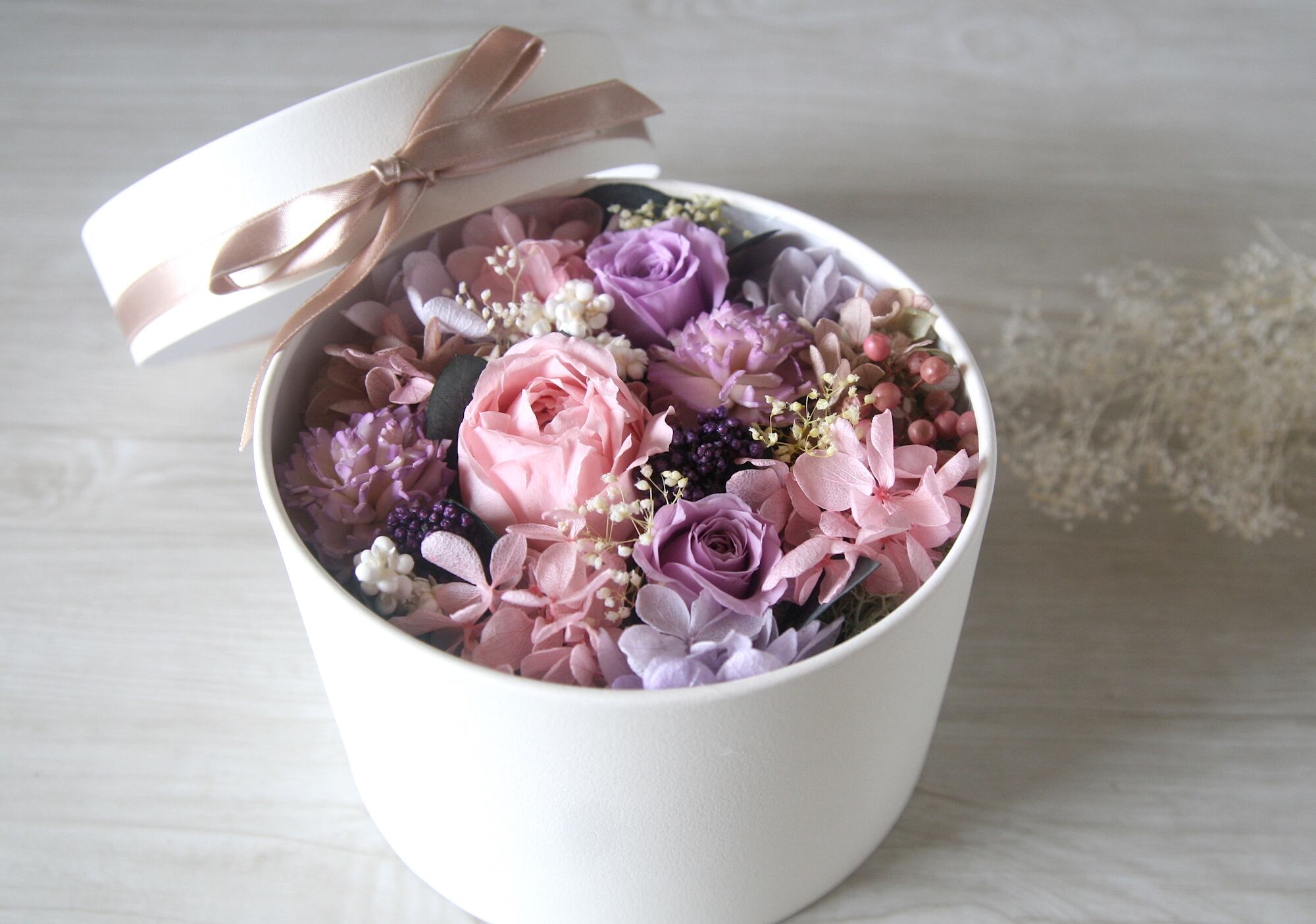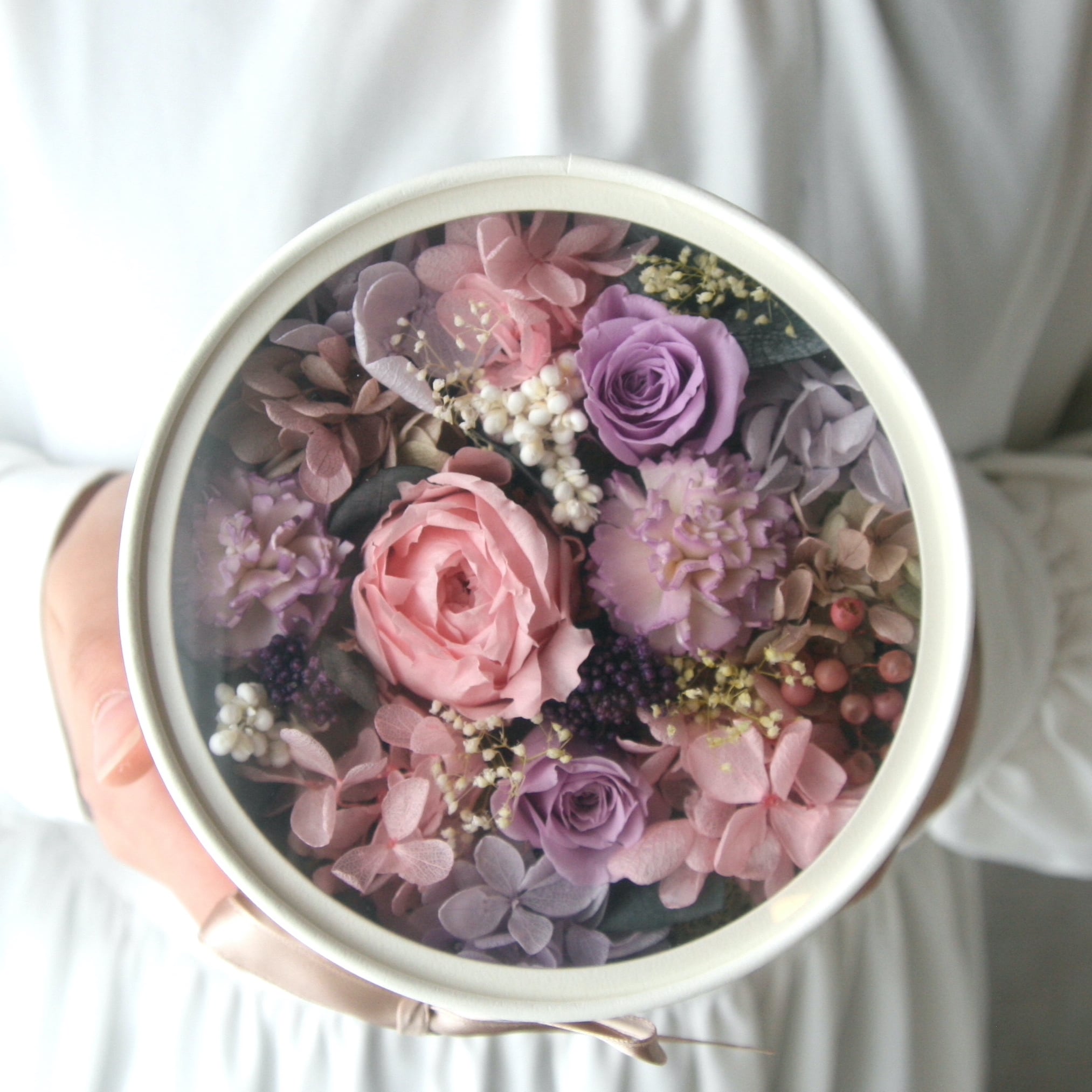 プリザーブドフラワーのローズ、アジサイなどを使用した華やかなフラワーボックス。中が見えるデザインです。